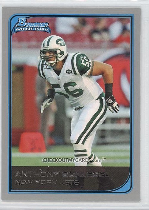 BiographyAnthony Schlegel (born March 1, 1981) is an American Football linebacker who is currently a free agent. He was originally drafted by the New York Jets in the third round of the 2006 NFL Draft. He played college football at Ohio State University after transferring from the United States Air Force Academy.